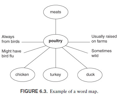 In order to implement this strategy, you need a word map that allows students to show connections. This word map might be drawn on the board, presented with an overhead projector, or duplicated on paper for students to use. A simple word map has a space for the word, the connections to its superordinate category (the class to which it belongs), its characteristics or attributes, and some examples. Figure 6.3 provides an example of such a map. In it, the word poultry is shown to be a member of the category meats. Specific characteristics are provided along with three examples.