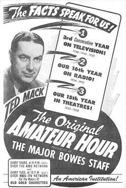 The other big "amateur" influencer was the impresario Edward "Major" Bowes, who had hosted small amateur nights around the country before bringing "The Original Amateur Hour" to New York radio station WHN in 1934. Throughout its run, it was among the top ten radio broadcasts in the U.S.; after Bowes's death in 1948, his talent coordinator Ted Mack took over and brought the show to national television, where it ran through 1970 (plus a one-season revival in 1992). Many "Amateur Hour" contestants — including Frank Sinatra, Maria Callas, Gladys Knight, and José Feliciano — went on to have successful professional careers. Of course, many more did not. (In the early years the really awful performers were cut off by the ringing of a large gong.) By the 1950s, both "amateur night" and "amateur hour" were stand-ins for "inept" or "disorganized,"; as in a 1952 story in the Los Angeles Times that described Senator Estes Kefauver's presidential campaign as having "a strictly 'amateur night' atmosphere about it."