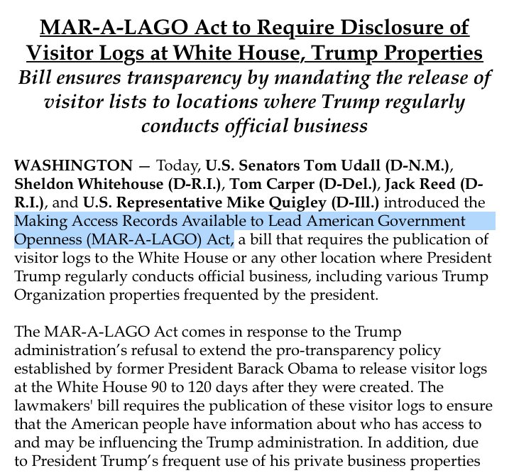 MAR-A-LAGO. The name of president's private Florida golf club, whose Spanish name means "ocean to lake," was backronymized into the "Making Access Records Available to Lead American Government Openness" act in March 2017.