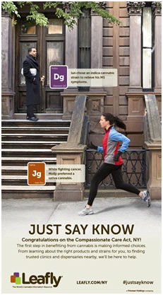 Leafly. On August 3, the company that calls itself "the world's largest cannabis information resource" took out a full-page advertisement in the Sunday New York Times, congratulating New York State on the passage of a medical-marijuana law (and touting its own cannabis-comparison service). The ad was both revolutionary and reassuring: It resembled something a mainstream pharmaceutical company might produce, and it used a slogan — "Just Say Know" — that played on the anti-drug "Just Say No" rallying cry of the 1980s and 1990s.