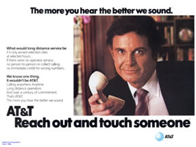 Michael J. Arlen, whose 1979 New Yorker articles about that campaign were later published as a book, Thirty Seconds, quoted an Ayer executive, Jeffrey Pfiffner, as saying that AT&T wanted "to overcome the negative emotions associated with long-distance ... the high cost of long-distance, the bad news in the middle of the night. ... AT&T wanted us to emphasize the casual, positive aspect: long-distance is fun, it's easy, it's cheap." Two slogans were tested: "Keep in Touch, America," and "Reach Out and Touch Someone." The final vote went to "Reach Out," Pfiffner said, "because the consensus seemed to be was that if there was one thing America didn't need at that time it was more America-oriented advertising." Pfiffner went on: