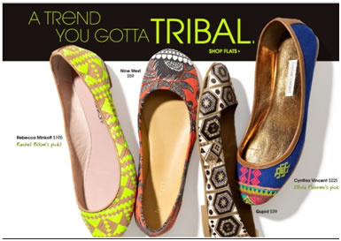 But none of that clarifies "tribal" in the Piperlime ad, or in the recent Guardian (UK) headline that proclaimed "Tribal Fashion Grows Up." (The accompanying photo depicts a model wearing a black military-style jacket, roomy trousers, a leopard-print belt, and multicolored hip pouches trimmed in cowrie shells.)