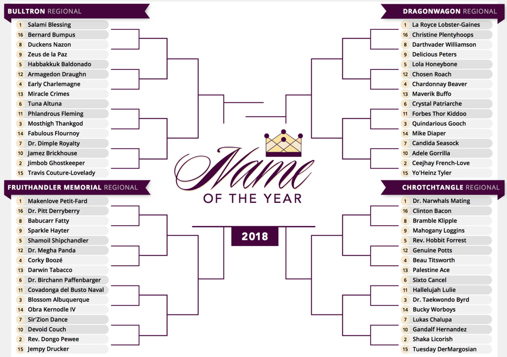 Using those criteria, I'd say the 2018 bracket isn't quite as rich as last year's, which included Marmaduke Trebilcock, YourMajesty Lumpkins, Mythzard Thelisma, Aphrodite Bodycomb, and Waylain September. (The overall winner was Kobe Buffalomeat.)