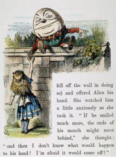 What Lewis Carroll and his great illustrator, John Tenniel, contributed to the story is the image of Humpty Dumpty as an easily cracked egg – or, more precisely (in Alice's words), a creature "exactly like an egg." (Humpty counters: "My name means the shape I am.")