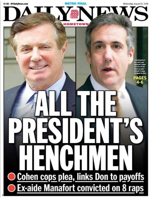 On August 22, 2018, after one of President Donald Trump's associates was convicted of fraud and another pleaded guilty to bank fraud, tax evasion, and campaign finance violations, the New York Daily News published a front-page headline with unusual historical and literary resonance.