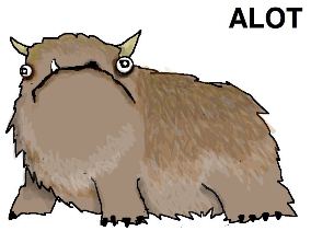 Allie, of the delightful blog Hyperbole and a Half, has gone so far as to develop a coping mechanism, a creature she calls "the alot." Allie is nonetheless too kind because, as you can see in the artist rendering, her alot is adorable. The REAL "alot" is not.If you know why people continue to write "alot," please let me know in the comments below, ideally before it becomes an acceptable variation of "a lot," which at this rate it almost surely will. Maybe, just maybe, if we find out why they do it, we can find a way to make them stop.