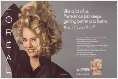"The power of the commercial," Gladwell writes, "was originally thought to lie in its subtle justification of the fact that Preference cost ten cents more than [rival Clairol's] Nice 'n Easy. But it quickly became obvious that the last line was the one that counted. On the strength of ‘Because I'm worth it,' Preference began stealing market share from Clairol." L'Oreal has used the slogan continuously for 40 years, changing only the pronoun ("Because you're worth it," then "Because we're worth it.") In 1997 L'Oreal appropriated the slogan — originally intended solely for one brand of hair color — as the tagline for the entire company. (In a brazen bit of imitation, or homage, Because I'm Worth It became the title of one of the hugely popular "Gossip Girl" books.)