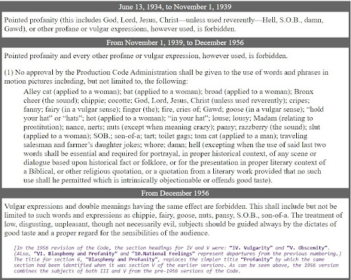 The Code, which held sway between 1934 and 1968, prohibited a wide range of language in Hollywood scripts. Damn and hell were taboo “unless used reverently” — “Damn the torpedoes, full speed ahead!” was nixed in a World War II movie — and stronger language was simply out of the question. So were a lot of words that seem innocuous to us in 2021: broad (a woman), cripes (a “minced oath” derived from “Christ”), lousy, and nuts (“except when meaning crazy”). A character could say that a scheme “sounds nuts,” but he couldn’t exclaim “Aw, nuts!” when the plan was foiled. (Read more about the evolution of nuts in my March 2021 post for the Strong Language blog.)