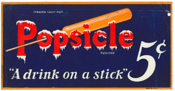Popsicle: The Popsicle website claims this frozen treat was invented by accident in 1905 by 11-year-old Frank Epperson when he left a mixture of powdered soda, water, and a stirring stick on his porch overnight. (The site doesn't specify where this took place; Epperson's 1983 obituary said San Francisco, but temperatures there never dropped below freezing in 1905. Epperson in fact grew up across the bay, in Oakland, and that's where he was living when he patented his "frozen confectionery" in 1923.) Epperson originally dubbed his creation the Epsicle, a blend of Epperson and icicle, but eventually renamed it Popsicle, allegedly because his children called it "Pop's 'icle." That too seems a stretch: as an early ad makes clear, the pop more likely came from "lollypop" (or lollipop), a word that first appeared in English in the late 18th century. In England, ice pops are called ice lollies.