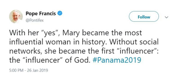 Then, on January 26, Pope Francis. possibly aiming to seal his cool-pontiff legacy, told an audience at Catholic Youth Day, in Panama, that the mother of Jesus was "the first 'influencer'." He, or his deputy, later repeated the assertion on Twitter.