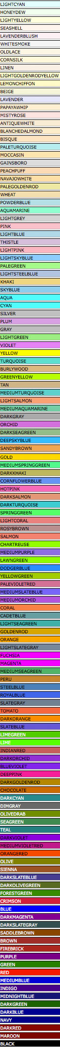 Of course, fanciful color names are only part of the story: to create standardized colors, we still need numeric or alphanumeric codes. In the hexadecimal system used by Web programmers, for example, every color can be expressed by a six-character string, from #FFFFFF (pure white) to #000000 (pure black). Yet even "hex" charts include language that can be indirect and even poetic, as demonstrated by this chart of color samples for Web use. The alphanumeric codes appear straightforward, even clinical. But the names seen here to the right — Old Lace, Papaya Whip, Moccasin, Gainsboro, Honeydew, Peru, Firebrick — are as lyrical and metaphorical as anything you'll find in a paint store. Or, for that matter, a box of crayons.