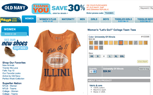For back to school, Old Navy offers 30% off this innovative "Lets go Illini" women's t, introducing the new form lets — you only get the apostrophe if you pay full price. When the error was discovered, the company announced it would replace defective shirts and offer the remaining stock in Old Navy Outlets as factory second's. These t's with typos were "made in USA," not in some third-world country by child laborers too poor to have apostrophes. To insure quality control in the future, the retailer announced plans to hire unemployed English majors as clothing proofreaders. Or should that be ensure?