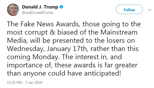 Whether fake news will outlive its 365 days of fame is anyone's guess. But at least one person is determined to capitalize on it – and to capitalize it – in an announcement about another awards presentation. Stay tuned Wednesday tonight!