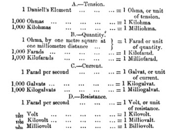 Would you agree that this seems like an unusually dense collection of eponyms? It turns out that there's a tradition about this. And in a particularly satisfying bit of lexicography, we know exactly how it started. By the mid-19th century, although the electrical industry was expanding rapidly—by 1858 the first trans-Atlantic telegraph cable had already been laid—there were no standards even for the names of basic electrical units. In 1861, Josiah Latimer Clark and Charles Tilston Bright, two British electrical engineers, addressed themselves to this issue and presented their proposal for "universally received standards of electrical quantities and resistances" to the British Science Association. They published their ideas in a short article titled "Measurement of Electrical Quantities and Resistance" in the very first edition of The Electrician: A Journal of Telegraphy. Here's the bit that gets the ball rolling on our tour of famous names: