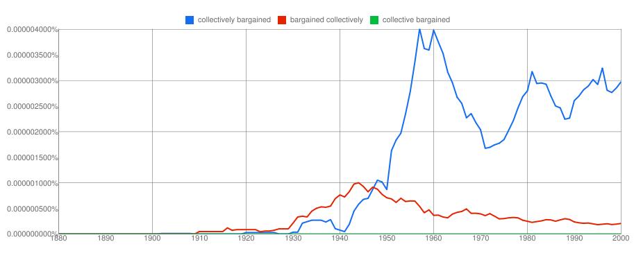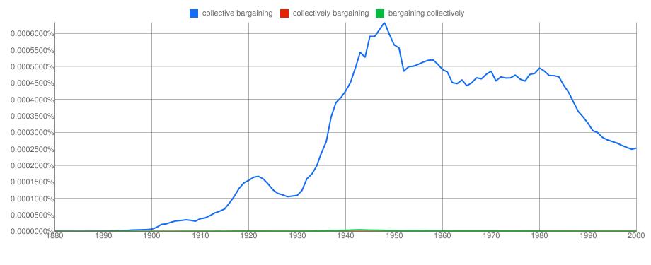 Still and all, among these three phrases, it was collective bargaining that caught on, as we see in the Google Ngram Viewer comparison. The green line for bargaining collectively just looks like someone unrolled a sheet of artificial grass on top of the x-axis, with a slight bulge in the 1940s where they neglected to level a gopher mound. Under the bulge you can catch a glimpse of the even flatter red line for collectively bargaining.
