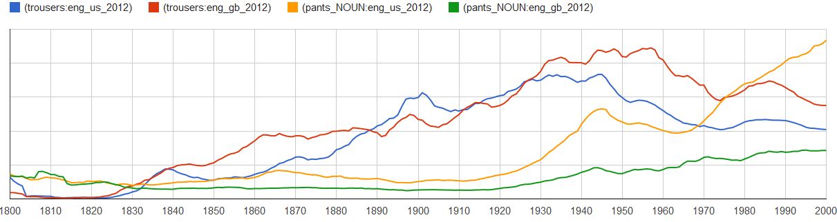 Since the mid-1800s, pants and trousers have gone in somewhat different directions in British and American English. In both varieties, trousers increased until peaking in 1945 (according to the new and improved Google Ngram graphic shown below), but even then, trousers was more frequent in British English than in American English, a situation that began in 1927 and still holds today.