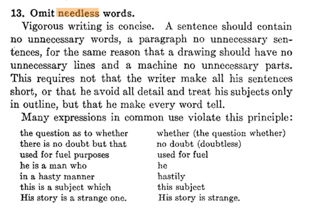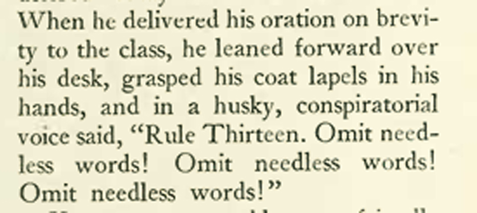 No one can really shrink the rules for writers down to an easily-swallowed pill, a 43-page essay, or even a long, rambling tome, and hope to be successful, because writing doesn't respond well to formulas, and no set of rules can anticipate the situations writers have to deal with daily. But true to the spirit of brevity that writing teachers often extol, Strunk's Rule 13 states, "Omit needless words," and that's pretty much what he did: Strunk wrote only one other book, a 73-page study of English meter.