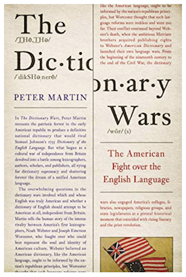 The history behind these habits of usage is complex and fascinating, and not at all what you might think. Up until now, that history has never been laid out in a comprehensive way. But Peter Martin's new, excellent, and engaging book remedies that. The book is The Dictionary Wars and it is an account of the beginnings, twists, and turns in American lexicography that have led to the unique place of the name "Webster" in the minds of Americans today. If you're a lover of words and dictionaries, you'll want to put this book on your reading list.