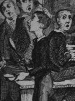 - Hold a brief discussion about the tone (or mood) of the scene and have students identify particular descriptions or images from the scene that contribute to the tone (e.g., starving boys devouring the gruel, Oliver boldly asking for seconds, Oliver being hit over the head with a ladle).