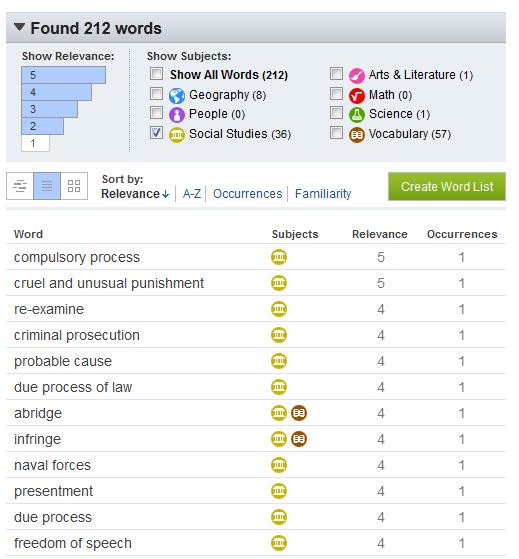 - Through group discussion, establish that the terms at the top of the list (all indicated with the gold Social Studies icon of the courthouse) are important and highly relevant to understanding the text of the Bill of Rights, whereas the words at the bottom of the list are common words in the English language.