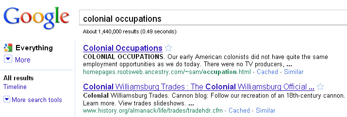 - Return to Google and run a search with a pair of keywords that you have revised from the warm-up exercise. For example, a search for "colonial occupations" yields the following results, all of which are resources for researching how colonial settlers earned a living: