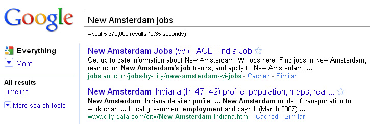 - Point out that the first couple of resources that come up in Google are sites to help people find jobs in New Amsterdam, Wisconsin and in New Amsterdam, Indiana (as opposed to colonial New Amsterdam):