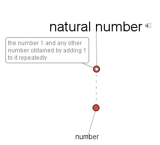- In the VT word map display for "natural number," follow the dashed "type of " line toward the word "number" and hover the cursor over the definition of number as "a concept of quantity involving zero and units." Click on that red meaning bubble in order to make that meaning the center of a map that reveals all the types of numbers the VT contains in its database: