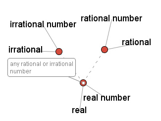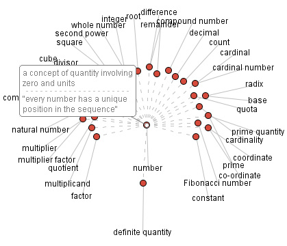 - In the VT word map display for "natural number," follow the dashed "type of " line toward the word "number" and hover the cursor over the definition of number as "a concept of quantity involving zero and units." Click on that red meaning bubble in order to make that meaning the center of a map that reveals all the types of numbers the VT contains in its database: