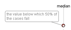 Display the Visual Thesaurus word map for median, pointing out the definition "the value below which 50% of the cases fall" and explaining that the median value in a set of numbers is the number in the middle.