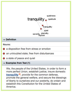 - Elicit from groups their lists of nouns from the preamble. As each group volunteers a word, verify its status as a noun by clicking on that word in the "VocabGrabbed" tag cloud to view its word map. (Words with red meaning bubbles in their word maps are potentially being used as nouns in the preamble.)