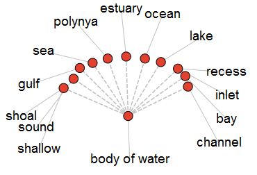 - Display the word map for gulf and scroll the cursor over the dashed line that sows that a gulf is "a type of" a body of water. Then, click on the red bubble defining body of water as "the part of the Earth's surface that is covered with water" to reveal all the types of bodies of water in the Visual Thesaurus database.