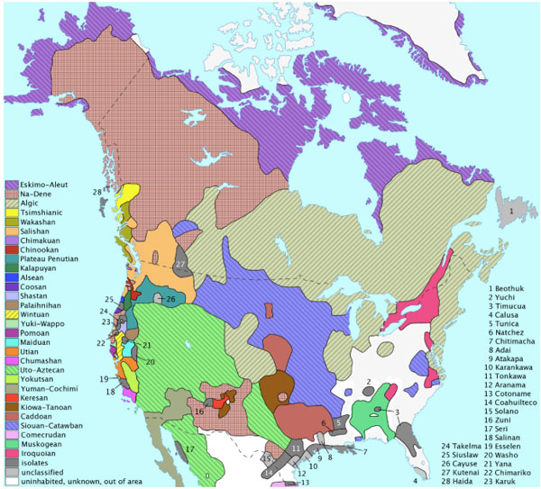Nearly ten years ago, Ben Zimmer wrote about the situation of English in the Philippines and the ways that both English and Spanish had made headway in the island nation, often to the detriment of the Philippines' more than 170 indigenous languages. The Philippines is a good example of a scenario that has played out around the world in the last 500 or so years, especially where a conquering or colonizing power has laid claim to an area inhabited by a great diversity of indigenous peoples: the colonizer's language first becomes the lingua franca, and then the majority language over several generations. During this time, smaller languages, one by one, fall by the wayside. This is certainly the case in North America as well, where prior to first European contact, a rich variety of languages flourished: