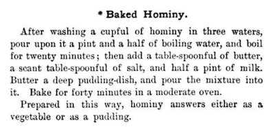 Grits is another food that features richly in my family's history. A search on it led me to Maria Parloa's Kitchen Companion, A Guide for All Who Would Be Good Housekeepers. It's a compendium nearly a thousand pages long that would bring even the most ignorant housekeeper up to speed, though with considerable effort. I learned from Miss Parloa a thing I didn't know about the connection between two familiar words, hominy and grits. Here's her explainer: "Grits is the name given to fine hominy in some sections of the South, 'hominy' there meaning the coarse hominy. Both the coarse and fine hominy are desirable food materials, and should be found in every household. The fine hominy can be used for many more purposes than the coarse, and is therefore more desirable."