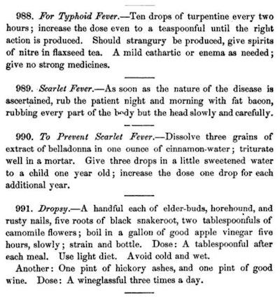 Households of yesteryear often did not have easy access to professional healthcare and it was typical for large cookbooks to include recipes for remedies of various kinds, for ailments common and uncommon. This can lead to somewhat less comfortable time travel, when you begin to wonder whether you might not be better off in the modern age. Here's a page from Mrs. Hill's Southern Practical Cookery and Receipt Book, originally published in 1872 and available today via Google Books in the original and in a modern reprint edition:
