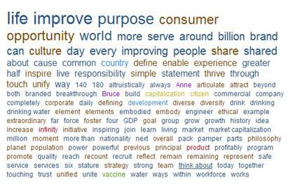 It's helpful to take a step back from some of these pages and analyze their content statistically; for that, we used VocabGrabber to make portraits of a few such pages, all from Fortune 100 companies. Here's one from Procter & Gamble: