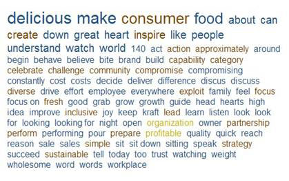For a company that is known chiefly for its hundreds of consumer products, this portrait seems to boil down to a worthy mission: "improve life." Kraft Foods also seems to be right on the money in making the most frequent words on its "Who We Are" page the ones that deliver its message: