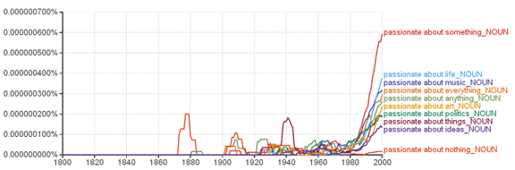 Before the 20th century, it seems that it was unusual for anyone to declare that they were passionate about anything. The spike in usage from 1870 to a bit after 1880 is in fact the phrase passionate about nothing. Starting in the 20th century, however, being passionate about something comes into fashion, and starting in the 1980s, declarations about passionateness all begin sharp ascents. Anyone at large in the Anglophone world today knows that it is now ordinary to declare that you are passionate about something. Does the phrase really mean anything particular? Are feelings so much more intense and focused today on aspects of our lives than they were for our Victorian counterparts? Probably not: we have simply diluted the strength of passion and passionate by using them as substitutes for words akin to enthusiasm, interest, or eagerness.