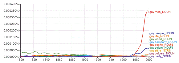 Starting in the 1970s, "gay men," and secondarily, "gay people" so overtook the earlier meanings of gay as to render them inoperative. The graph shows that there was indeed a "gay world" in 1800, but it was surely not the "gay world" that you evoke today when you use the term. As further evidence of the death of the old gay, Hallmark is this year marketing a Christmas ornament on which they have retrofittted new lyrics to the carol "Deck the Halls" to avoid use of the word gay. Gay apparel is simply not what it used to be!
