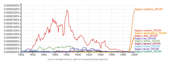 The frequent and sharply rising noun collocations of legacy today represent the modern development of the meaning of legacy, which has been considerably stretched from the original — perhaps in an attempt to put the most positive possible spin on the notion of "obsolescent." The legacy of the past, when the word's main usage was as a synonym of bequest, is represented by several moribund collocations that seem to have peaked in the late 19th century, such as legacy duty, legacy tax, and legacy hunter.