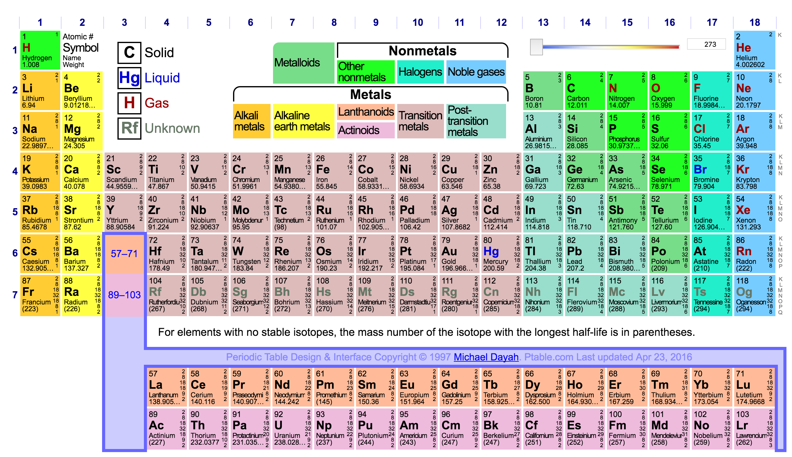 Many of the most commonly known metals, however, did not attract the -ium ending because they were known, mined, and manipulated long before the table was devised—indeed, even before there was any notion of the elements having atomic structure. The older metals were of particular interest to alchemy, the pseudoscience that is forerunner of modern chemistry, because its practitioners believed that the base metals (lead, iron, tin, and copper, for example) could be transformed into a noble metal (gold or silver). While all of these metals retain their native English names (all of which go back to Old English), the official symbols for these elements all give a nod to their Latin names: Au for gold (Latin aurum, which has an English cognate in aureole), Pb for Lead (Latin plumbum, which has an English cognate in plumb, Fe for iron (Latin ferrum, which has an English cognate in ferrous, and so forth. The interactive periodic table here provides hyperlinks that enable you to explore each of the elements and what lies behind their names.
