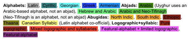 If we start from the fact that language is first and foremost a spoken activity, the methods by which people have extended its powers to writing offer a fascinating lens into human history from a social, psychological, linguistic, and political perspective. It's intuitive for English speakers that language should be represented graphically by an alphabet, even while English itself seems to maximize illogical use of an alphabet. But as the map and legend show, an alphabet is only one way that the spoken word finds its way onto the printed page or the neon sign. Other languages and language families have adopted different systems. In general, and when political events do not interfere (though they often do), languages seem to evolve writing systems on their native ground that make the most sense for the language.