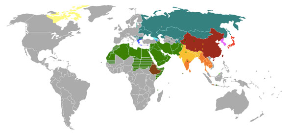 Without a legend you'd be hard pressed to figure out what's represented here, and what, in particular, is represented by gray, which is so often the color for "insufficient data" on maps of this kind. In this case, gray indicates the countries whose main language is written in a derivative of the Latin alphabet. The obscure event that has its centenary this month? It was on the 28th of December in 1918 that Emperor Khải Định of Vietnam (or French Indochina, as it was at the time) abolished the traditional script for writing the Vietnamese language in favor of the Latin script for the Vietnamese alphabet. Thus Vietnam, while ethnically much more akin to its immediate neighbors who eschew alphabetic writing systems, uses an alphabet that originated far away from it, in Europe. Here's the legend for the map: