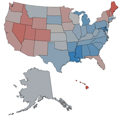 Happier states are shown in red, sadder states in blue, neutral states are gray. No one is surprised that Hawaii seems to be the happiest state. It also fits a popular stereotype that two states in the Deep South, Louisiana and Mississippi, where quality-of-life indices lag far behind the national averages in many areas, are the least happy.