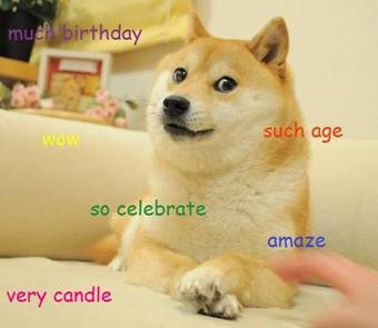 A couple of months ago Gretchen McCulloch, a linguist at McGill University, wrote insightfully about the linguistic aspects of the Doge meme. The Doge meme, for anyone who has averted their eyes from the Internet during the last six months or more, is a meme based on a few recurring elements: a photo of a Shiba Inu dog, surrounded by captions — ideally, in bright colors using the typeface Comic Sans — that violate various grammatical rules in a few specific ways. Here's a typical example of it.