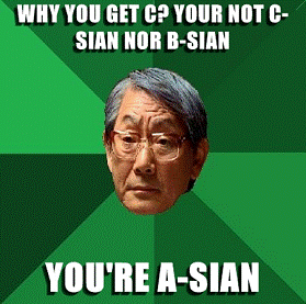 Other memes, such as the doge meme already mentioned, require a predictable and ideally consistent deviation from standard grammar or orthography that may exploit some aspect of the accompanying image. Of course we all know that Shiba Inus can't talk but we might like to think that if they could, they would devise a charmingly simplified version of English grammar, such as the one used in their memes. Then there is, as another example, the "high expectation Asian father" meme, which features the same Korean man with an anxious look, expressing expectations containing grammatical errors that people think of as stereotypical of Asian speakers who have learned English imperfectly: omission of articles, unconjugated or misinflected verbs.