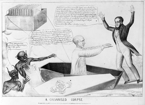 A new idea in the early 19th century was galvanism, which explored the connections between electrical current and physiological processes. Strange as it may seem, people speculated that an inanimate corpse might be "galvanized," that is, animated and brought to life, by the use of electrochemical means, as is spookily illustrated in this 19th century cartoon.