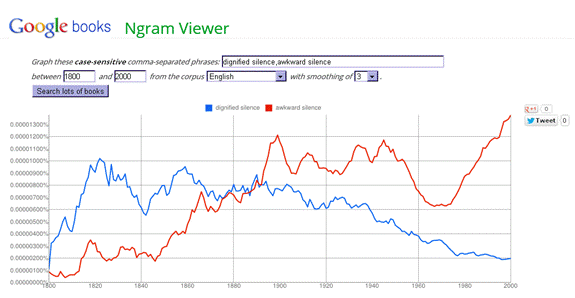 Dignified silence seems to have reached a peak of sorts around 1820 and it has been on a mainly downhill course since then. Awkward silence, on the other hand, seems set on an unstoppable career path. If you fear awkward silence yourself, you can generate this Ngram graph on your own internet-connected device and then click on Tweet, further contributing to the demise of dignified silence — for Twitter surely is the greatest threat to dignified silence that the modern world has yet developed. Other salient collocations of adjective + silence show similar patterns when viewed historically: embarrassed silence overtook respectful silence in about 1940; Eerie silence skyrocketed past discreet silence in the 1980s.