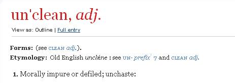 Second, unclean, from its debut in English, is a word freighted with far more associations that you would expect from a word that simply negates an extremely common and frequent adjective. Third, unclean is, despite its ancient pedigree, infrequent in English today, a fact this is surely connected with the second point: unclean is so laden with connotations of moral turpitude and disease that it's problematic to use it if you intend no more than a relatively judgment-free idea of "not clean." Unclean is used today overwhelmingly in writing on religion — an unsurprising fact when you take into account that unclean appears nearly 200 times in many standard Bible translations. Its most frequent collocation is "unclean spirit," another Biblical term with several mainly New Testament appearances. In Old Testament usage, the distinction between clean and unclean is frequently in reference to detriments from ritual purity. Leviticus has numerous references to uncleanliness as it pertains to animals and food, disease, and bodily discharges, all of which present impediments to those who would stand in the presence of God.