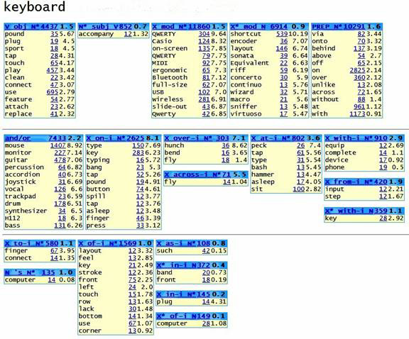With this sort of data, a lexicographer can easily identify everything pertinent there is to know about keyboard as a noun: its most frequent and most salient uses, its most typical collocates in every possible grammatical function, the frequency and nature of prepositional phrases that follow it or include it — along with the opportunity to view thousands of uses of it in context. A similar Word Sketch can be drawn up for the verb keyboard.