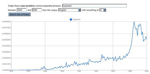 To illustrate the somewhat limited nature of the graphical presentation of Google book data from the point of view of the lexicographer, here's a graph of the word keyboard — a word that even nonlexicographers know has undergone a number of career enhancements and extensions since its introduction to English in the early 19th century: